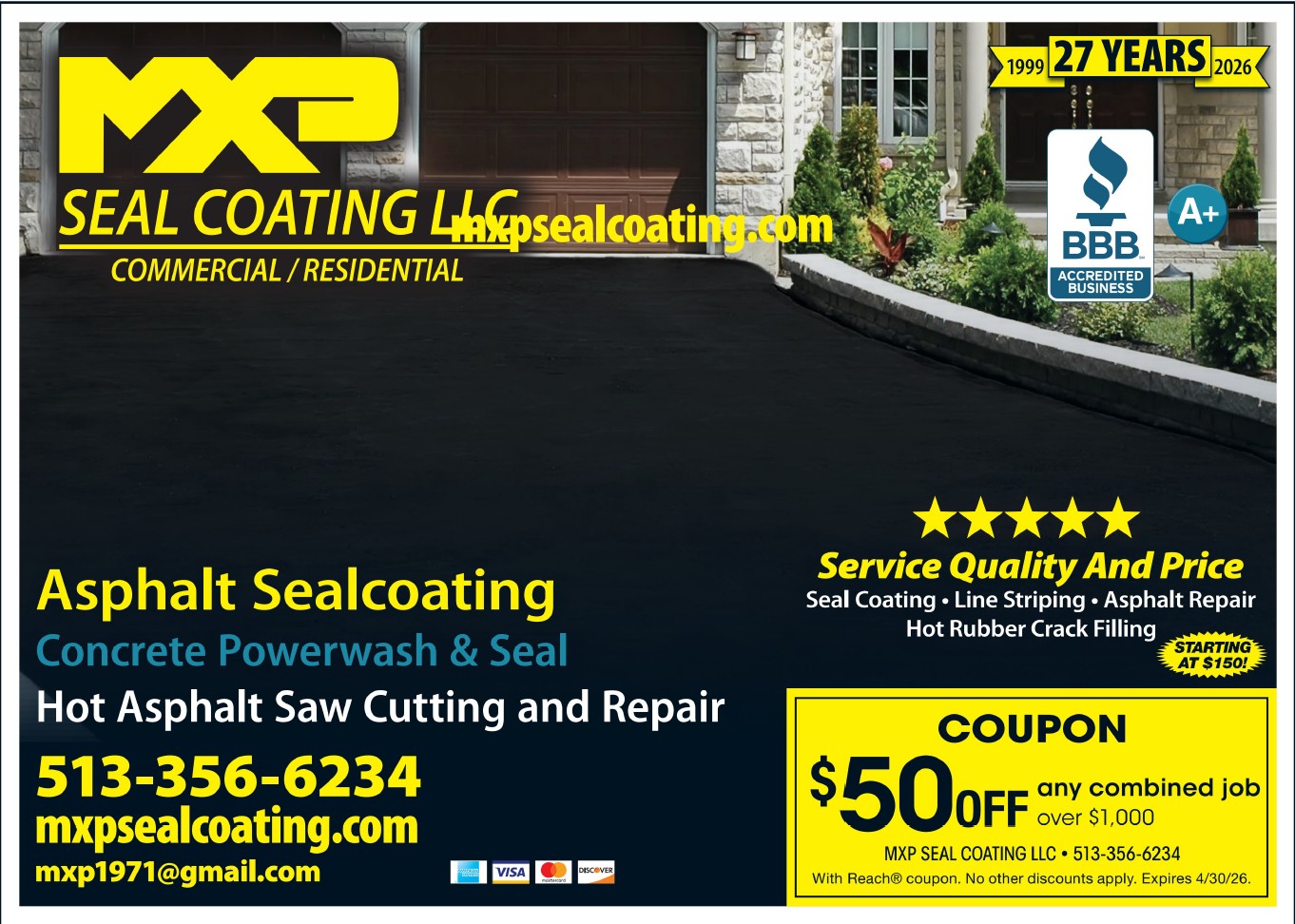 “Great service definitely will be letting my family & friends know who to call if they want their driveways sealed or repaired Thanks Again MXP for the outstanding job”